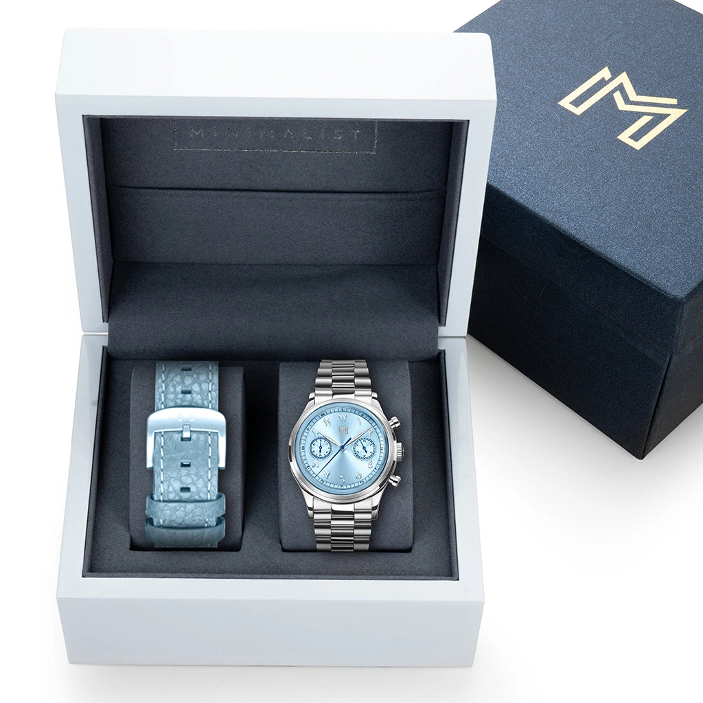 تصلك مجموعة ساعة فينتج كرونو في صندوق خشبي فاخر مصمّم بعناية ليعكس مستوىً رفيعاً من الفخامة لعشاق الساعات. يتضمن الصندوق بطاقة ضمان، وملحقاتها المختارة بعناية كقطعة القماش من المايكروفايبر وملصقات مميزة. والتي تضيف بصمة شخصية فريدة، مما يجعل تجربة فتح الهدية مميزة لعشّاق التفاصيل الدقيقة والحرفية العالية.