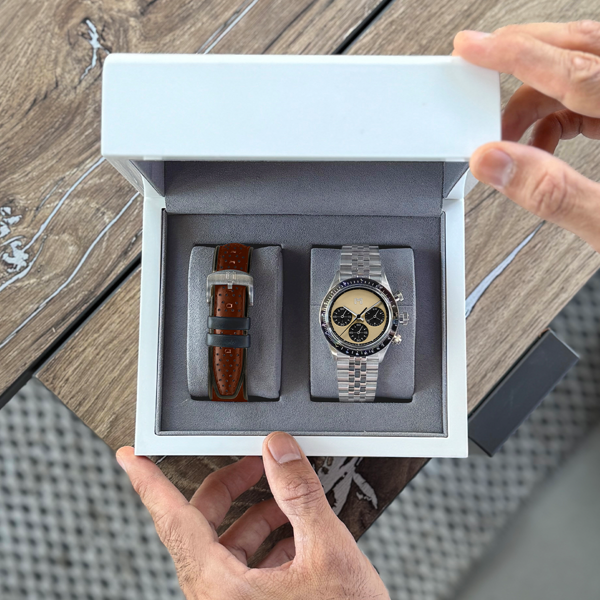 تصلك مجموعة فاست باك في صندوق خشبي فاخر مصمّم بعناية ليعكس مستوىً رفيعاً من الأناقة. يتضمن الصندوق بطاقة ضمان، وملحقاتها المختارة بعناية كقطعة القماش من المايكروفايبر وملصقات ممتعة، . والتي تضيف بصمة شخصية فريدة، مما يجعل تجربة فتح الهدية لعشّاق التفاصيل الدقيقة والحرفية العالية.