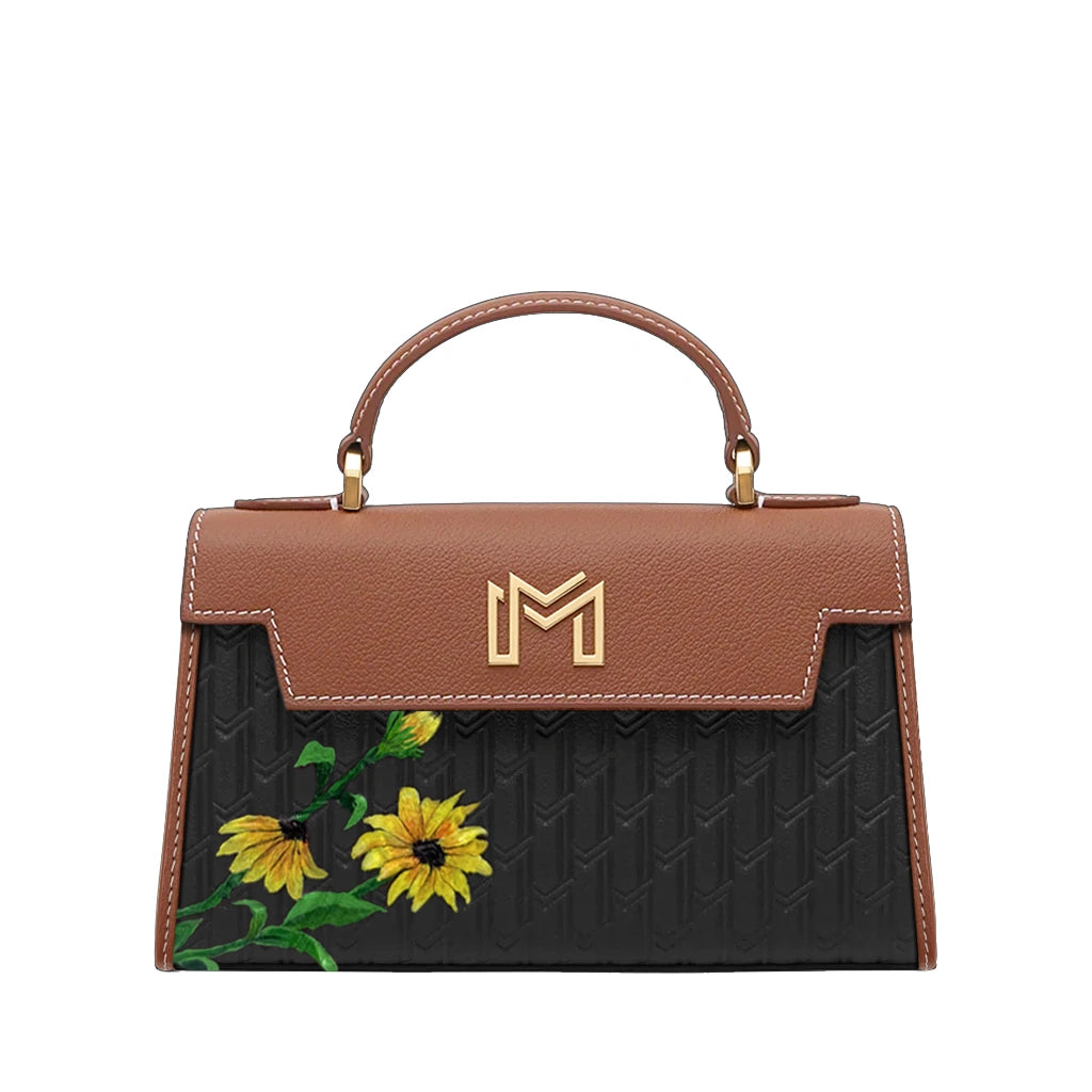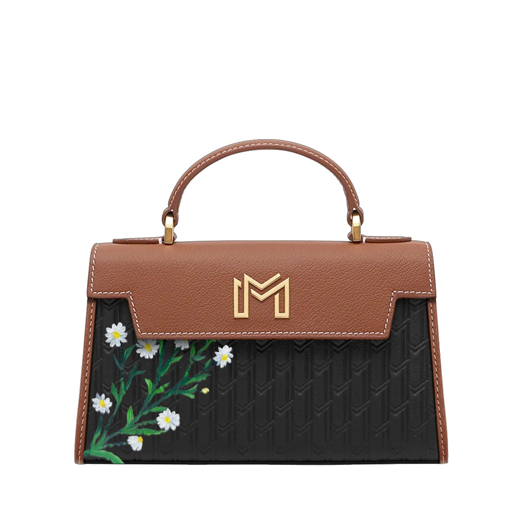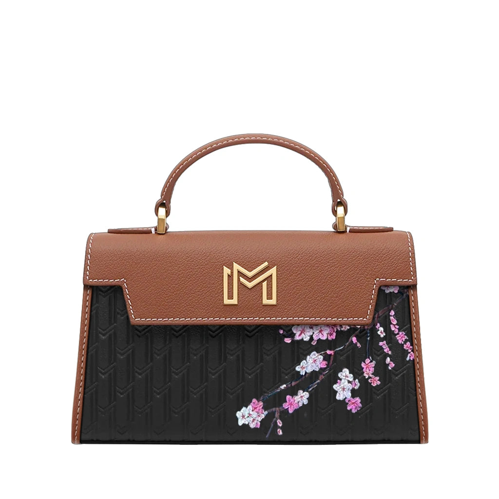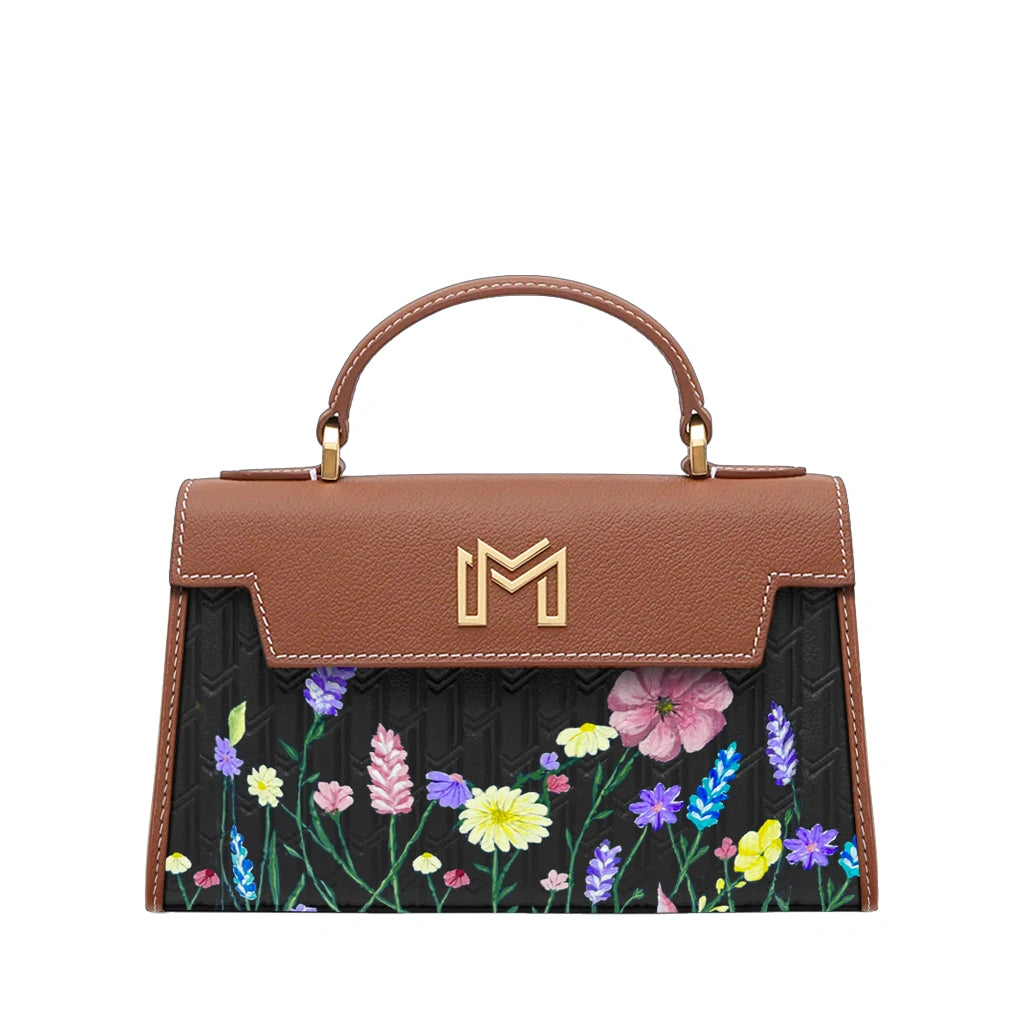 Meet Hessa, a true testament of elegance in compact form. Made from genuine camel leather beautifully decorated with gold toned hardware and embossed with the signature M pattern. Chic and convenient with a magnetic flap closure with a stunning grained texture and lined with microfiber suede. Seamlessly transition your look from a top handle carry to a crossbody with its removable strap.