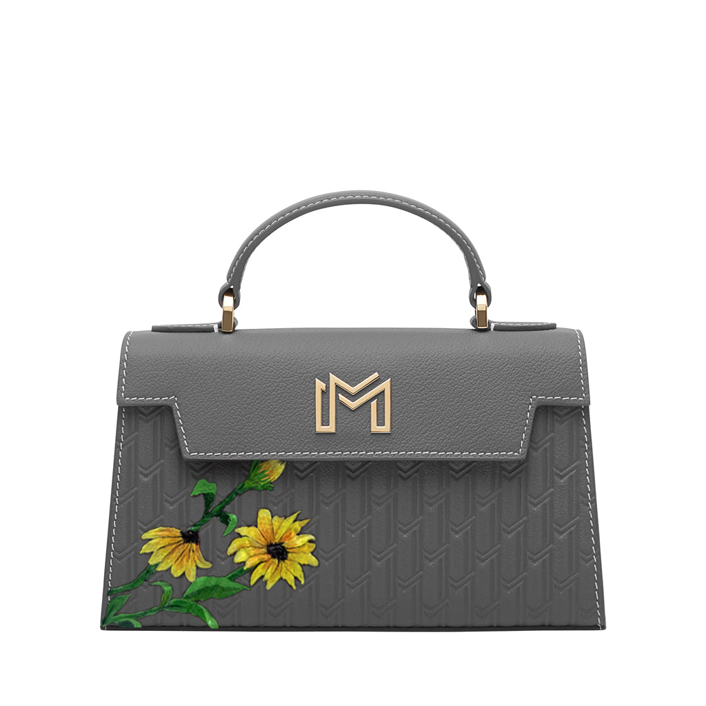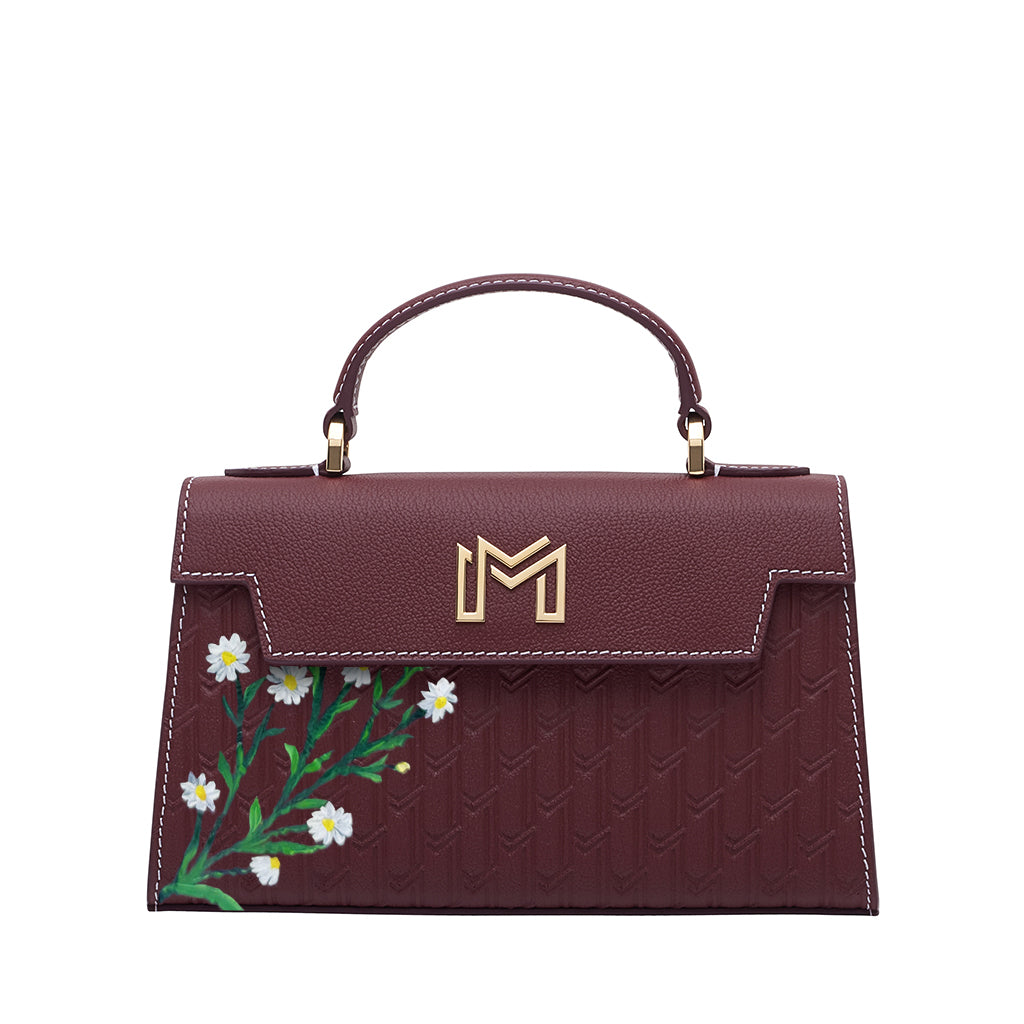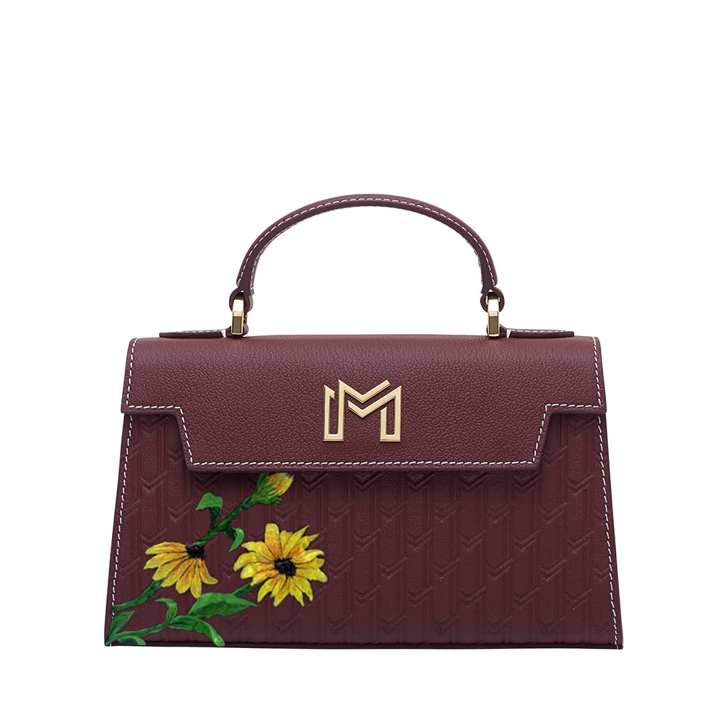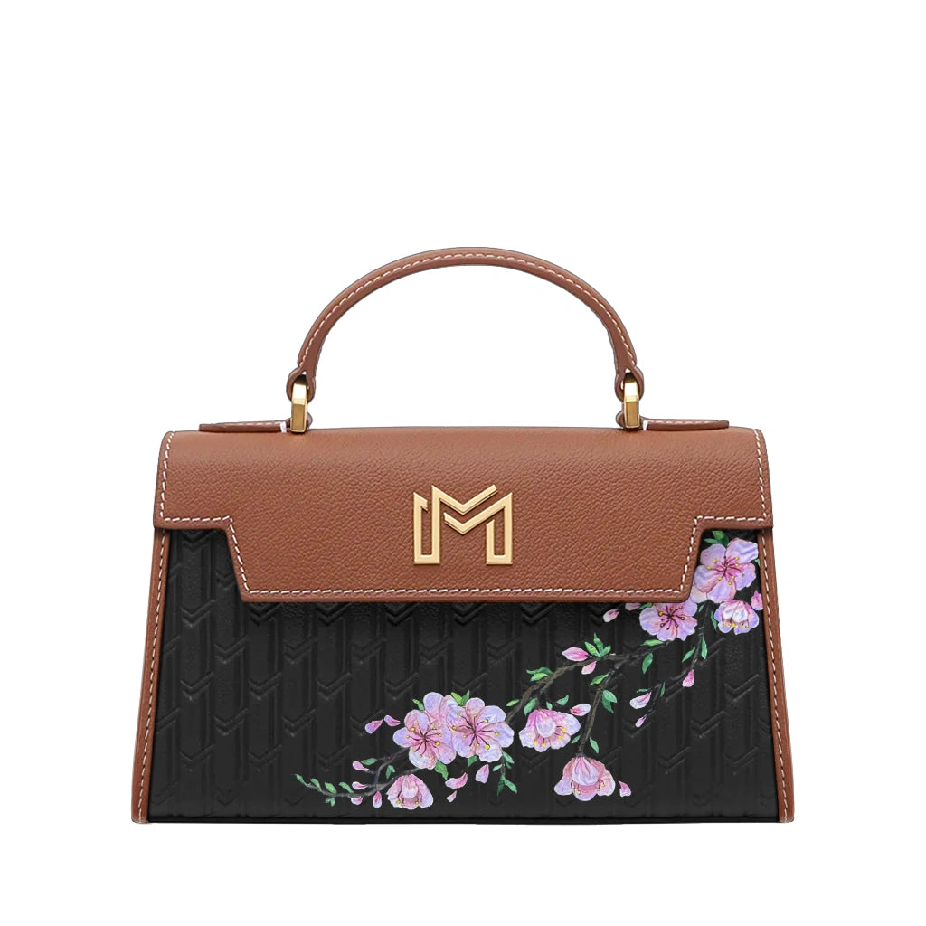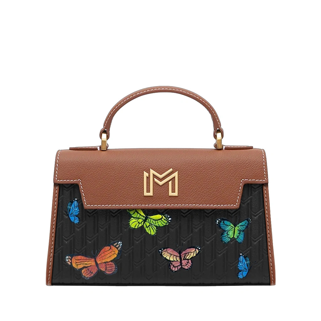 Meet Hessa, a true testament of elegance in compact form. Made from genuine camel leather beautifully decorated with gold toned hardware and embossed with the signature M pattern. Chic and convenient with a magnetic flap closure with a stunning grained texture and lined with microfiber suede. Seamlessly transition your look from a top handle carry to a crossbody with its removable strap.