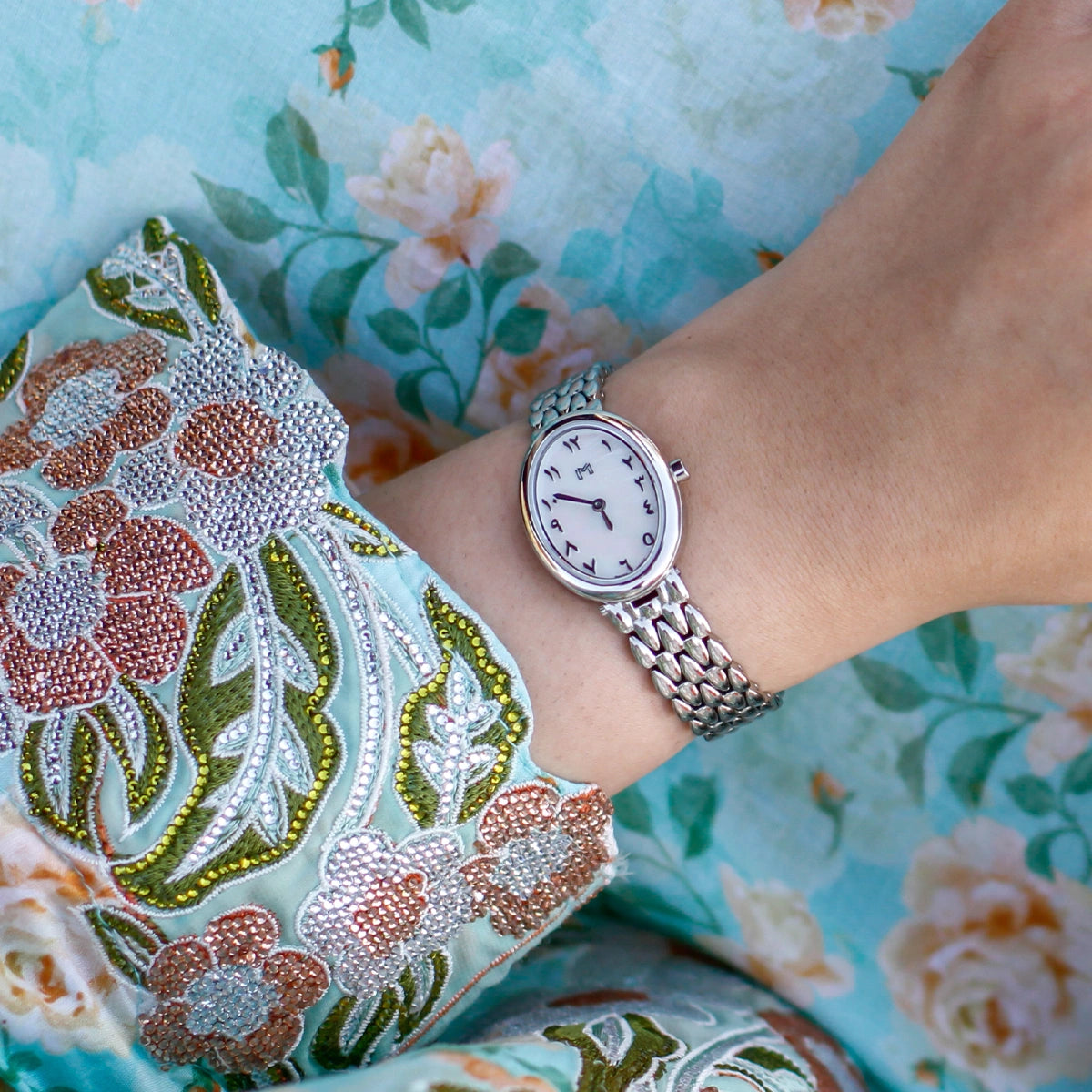 صُممت هذه الساعة لترافقك في إطلالاتك اليومية. بميناء بيضاوي أنيق مع سوار بحلقات مصقولة، لإنسياب سلس مع حركة معصمك ليمنحك خفةً مميزة ولمسة من الرقي البسيط الذي يرافقك طوال اليوم.