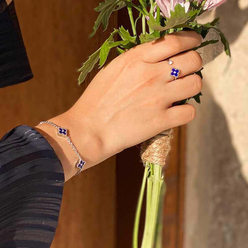 تتميز مجموعة ميني جوري بتصميم مصغر خالد، بأربع بتلات رقيقة وكريستالة متألقة، صممت لتمنحك أناقة يومية بلا عناء.