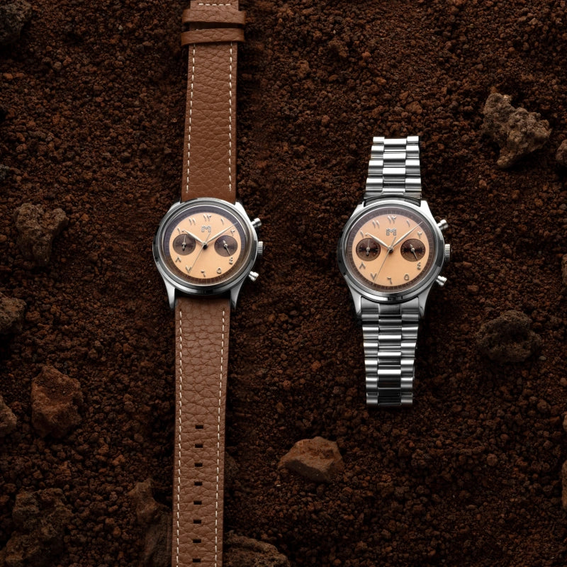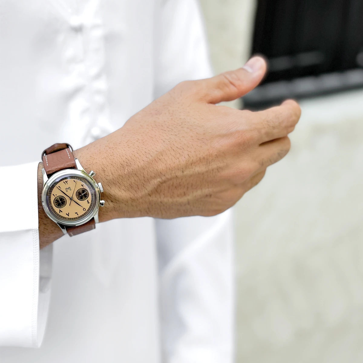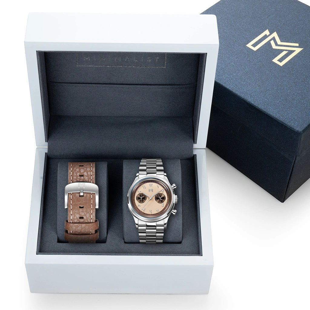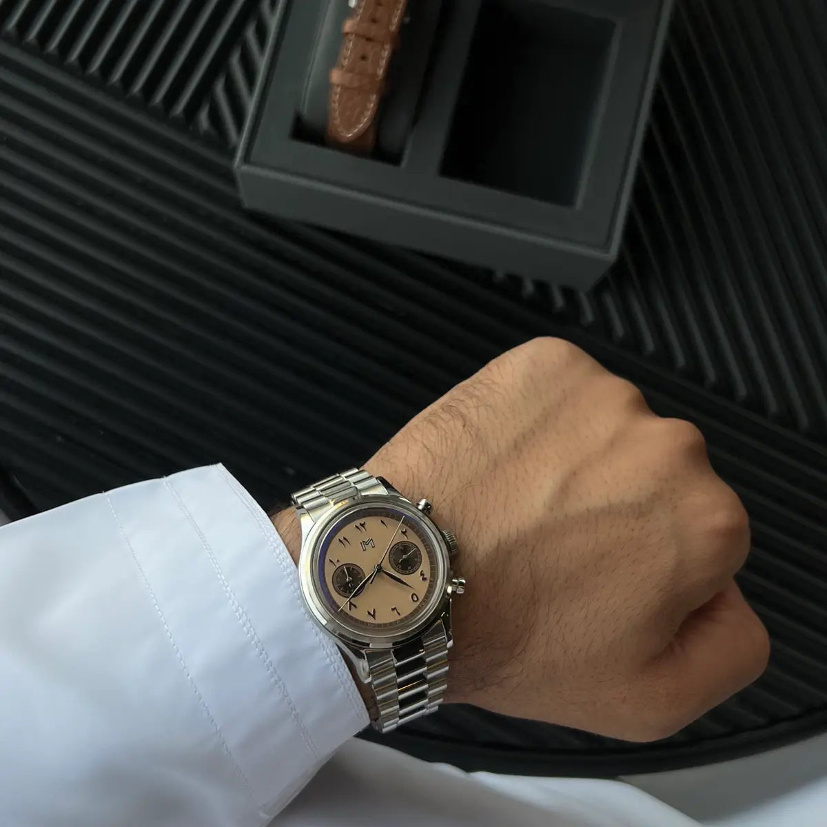 A vintage-inspired chronograph watch featuring a mecha-quartz movement, interchangeable leather and steel straps, and a timeless design crafted for all-day comfort.