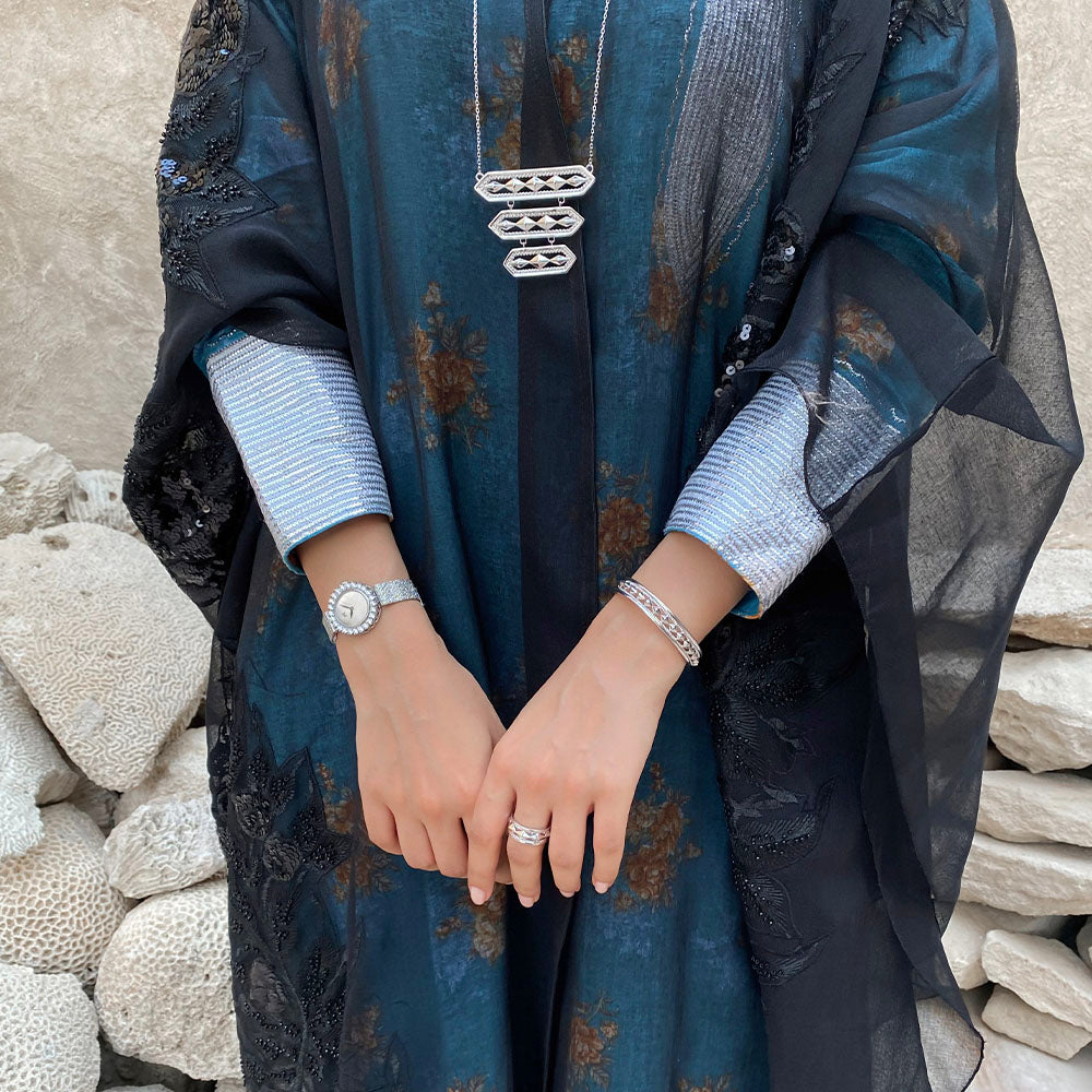 The Anaqa Collection is a refined jewellery set honoring Emirati Heritage, blending tradition with modern elegance through lightweight comfort and versatile design.