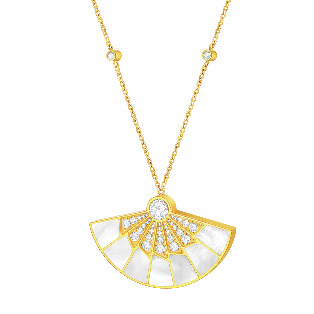 The Fan Collection is a graceful jewellery set that blends luxury with simplicity, featuring a delicate fan motif in mother-of-pearl and sparkling crystals for elegant daily wear and thoughtful gifting.
