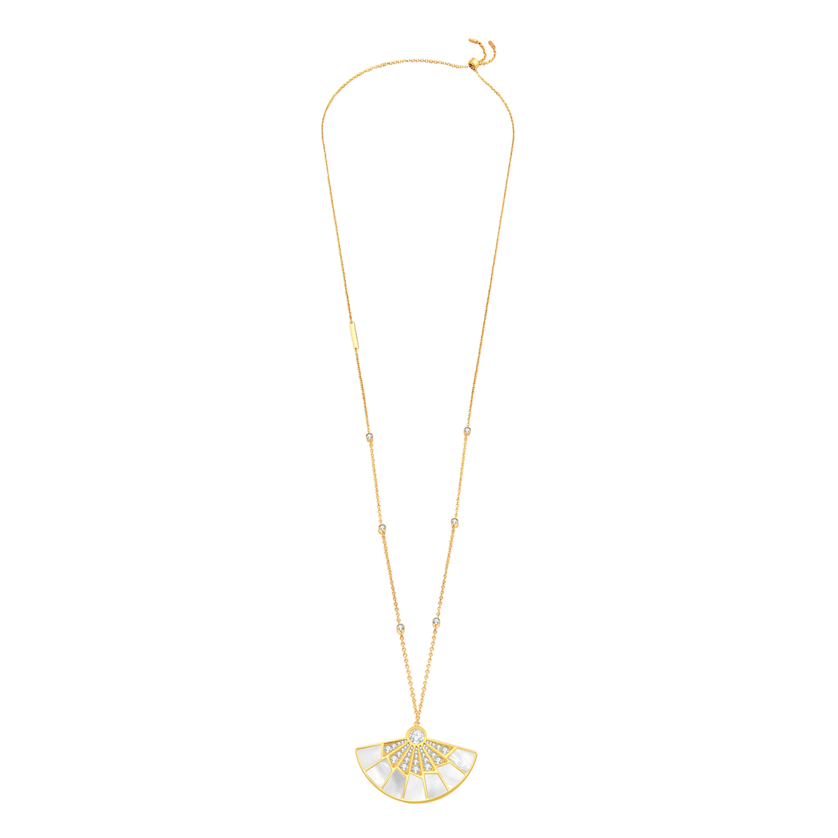 The Fan Collection showcases the natural radiance of mother-of-pearl through its signature fan motif, enhanced by precisely set crystals that catch and reflect light. The reversible stone design offers versatile styling options, while the double-chain bracelet creates graceful movement that elevates everyday looks with effortless sophistication.
