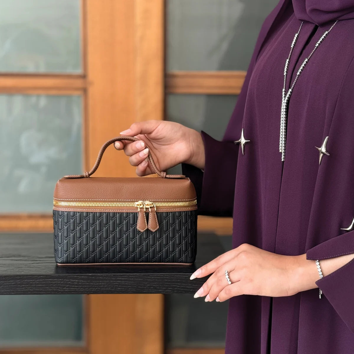Crafted for Emirati Women’s Day, the Maitha handbag blends femininity with elegance, featuring a structured silhouette and double zip closure.