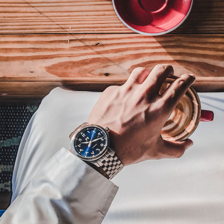 The pilot series is inspired by the historic aviation of the UAE starting in 1932. It is a vintage watch which is a piece of history on your wrist. Featuring large Arabic numbers to read in tough conditions, a large 42mm case to fit over pilot jackets and a large crown to change the time easily while wearing gloves. The hands are inspired by the wings of the airplane The hour markers inspired by the flaps of the airplane The pilot watch is robust and resistant, with a rugged and bold feel.