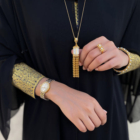 Unveil the beauty of the Sadaf Collection, designed exclusively for Ramadan. Adorned with graceful pearls, featuring a beautiful necklace with delicate dangling tassels and radiant crystals. With an adjustable bangle, the ideal gift for Ramadan & Eid.